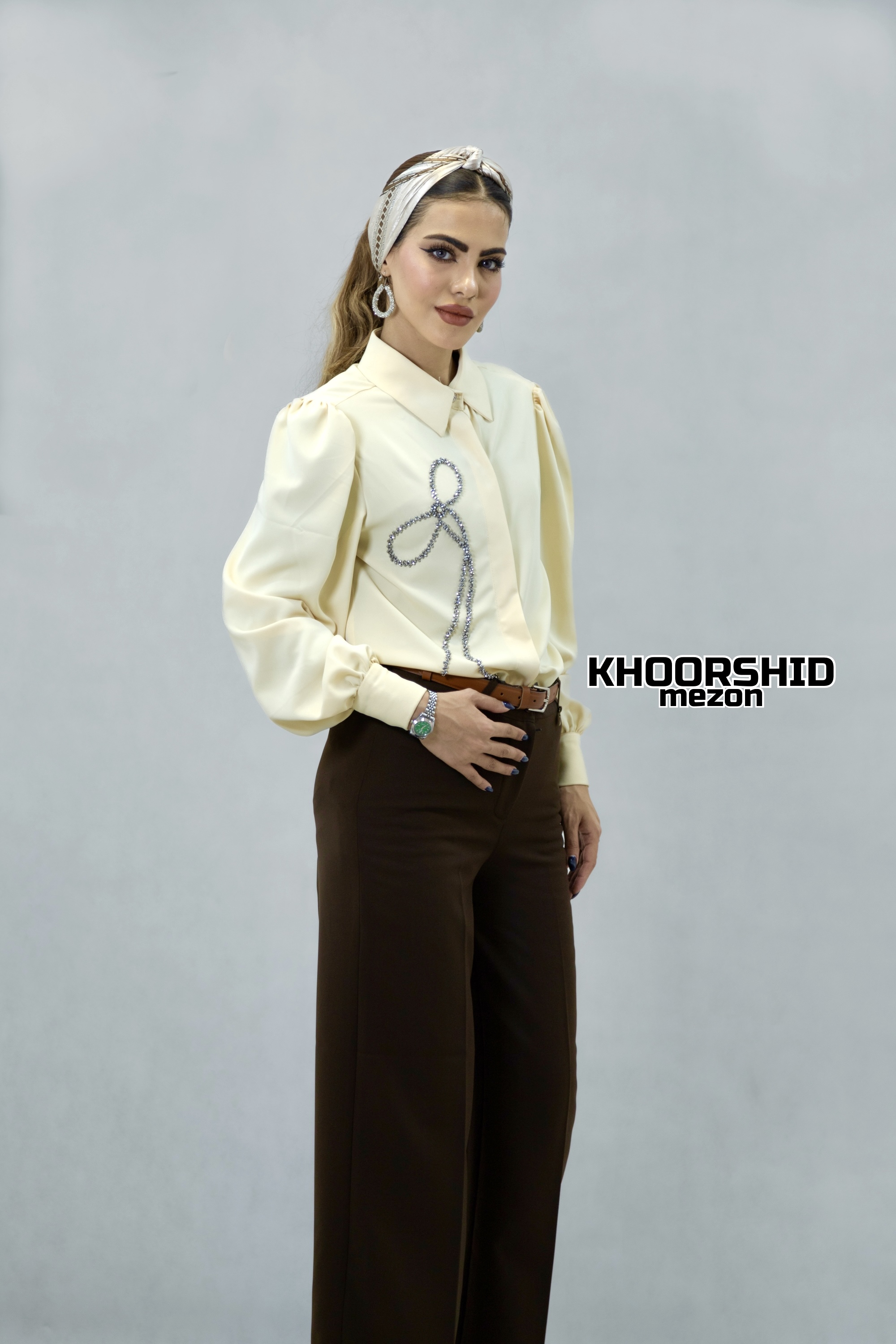 برای یک استایل مونوکروم و کشیده، میتوانید این شومیز را با یک شلوار پارچهای کرم یا فاقبلند سفید ست کنید. اگر به دنبال تضاد رنگی هستید، دامنهای مدادی مشکی یا شلوارهای طلایی-قهوهای جلوهای بینظیر به این کار میبخشند. استفاده از کفش پاشنهبلند نود (Nude) پاها را کشیدهتر نشان داده و هماهنگی کاملی با رنگ کرم شومیز ایجاد میکند